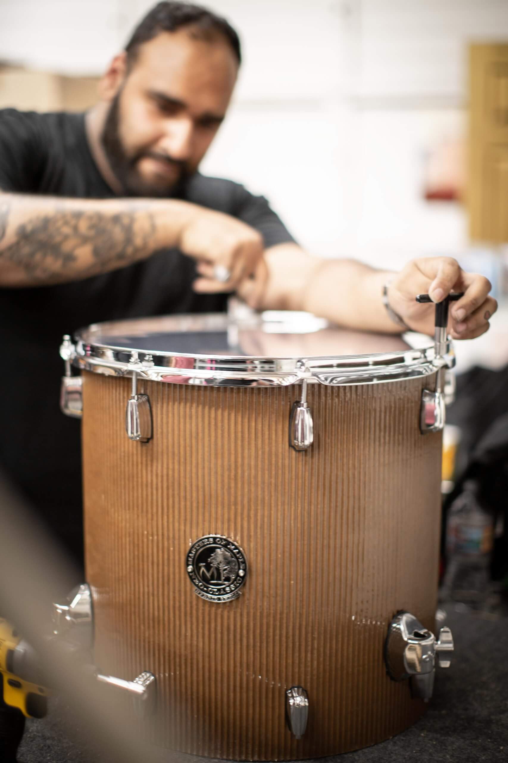 Could our beauty sound as good as it looks? You betcha, thanks to Sahir Hanif (a.k.a. Sy) the expert craftsman and founder at Masters of Maple. Affixing a drum head and assembling the instrument is usually a machine process, but Sy wanted to give the cardboard drum kit some extra love. He did the whole process by hand — drilling, sanding and shaping until the kit was ready for the spotlight.