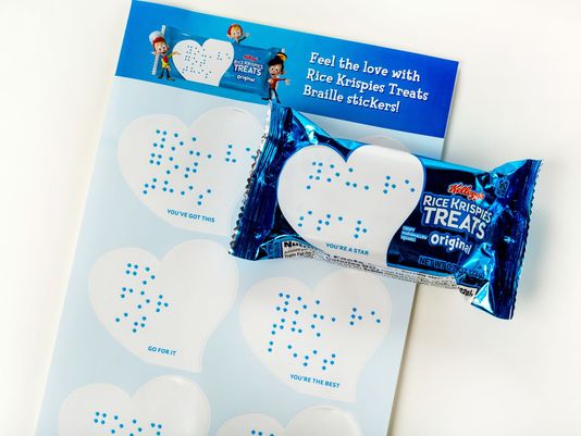 Parents can order a free sheet of braille stickers to affix to their child’s snack with encouraging messages, like “You’re a star” and “Love you lots.” For those who aren’t able to read braille, Kellogg’s also offers a custom cardboard box to hold a single Rice Krispie Treat that allows parents to record audio messages for their kids.