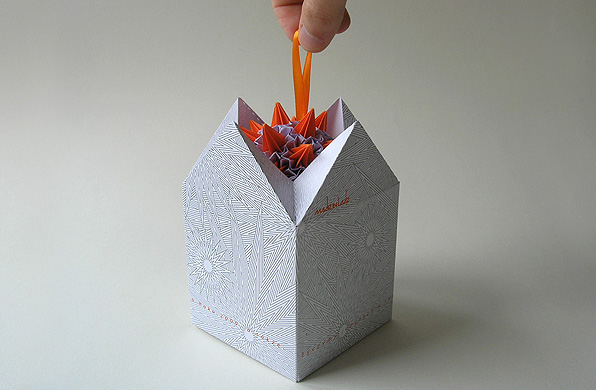 This striking paper box design would almost be a shame to wrap up! By pulling on the orange loop, it unfolds like an awesome origami sculpture to reveal the equally amazing paper star ornament inside. Beautiful AND functional!