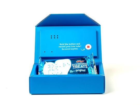 Parents can order a free sheet of braille stickers to affix to their child’s snack with encouraging messages, like “You’re a star” and “Love you lots.” For those who aren’t able to read braille, Kellogg’s also offers a custom cardboard box to hold a single Rice Krispie Treat that allows parents to record audio messages for their kids.